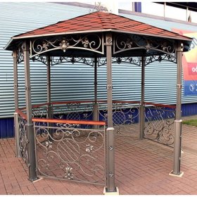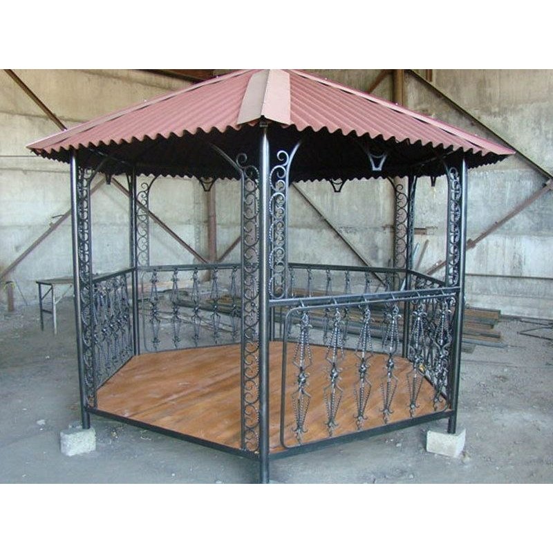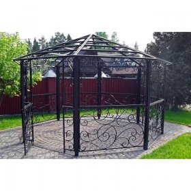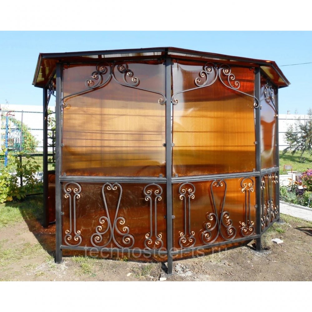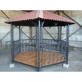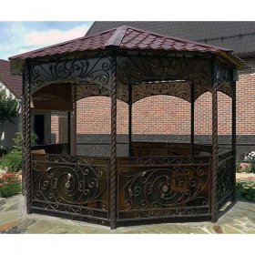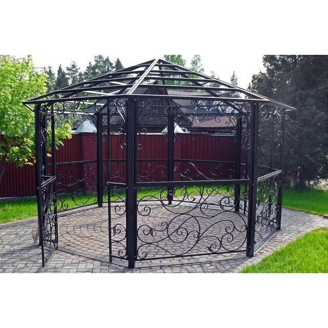 - Классические четырёхугольные — с ажурными стенами, кованой крышей и коваными лавками. Идеальны для чайных церемоний и вечерних посиделок.