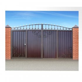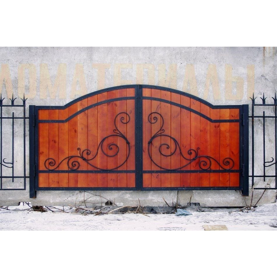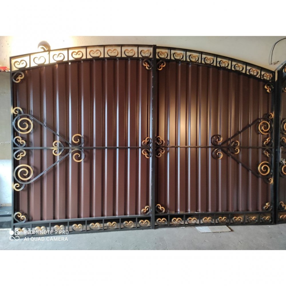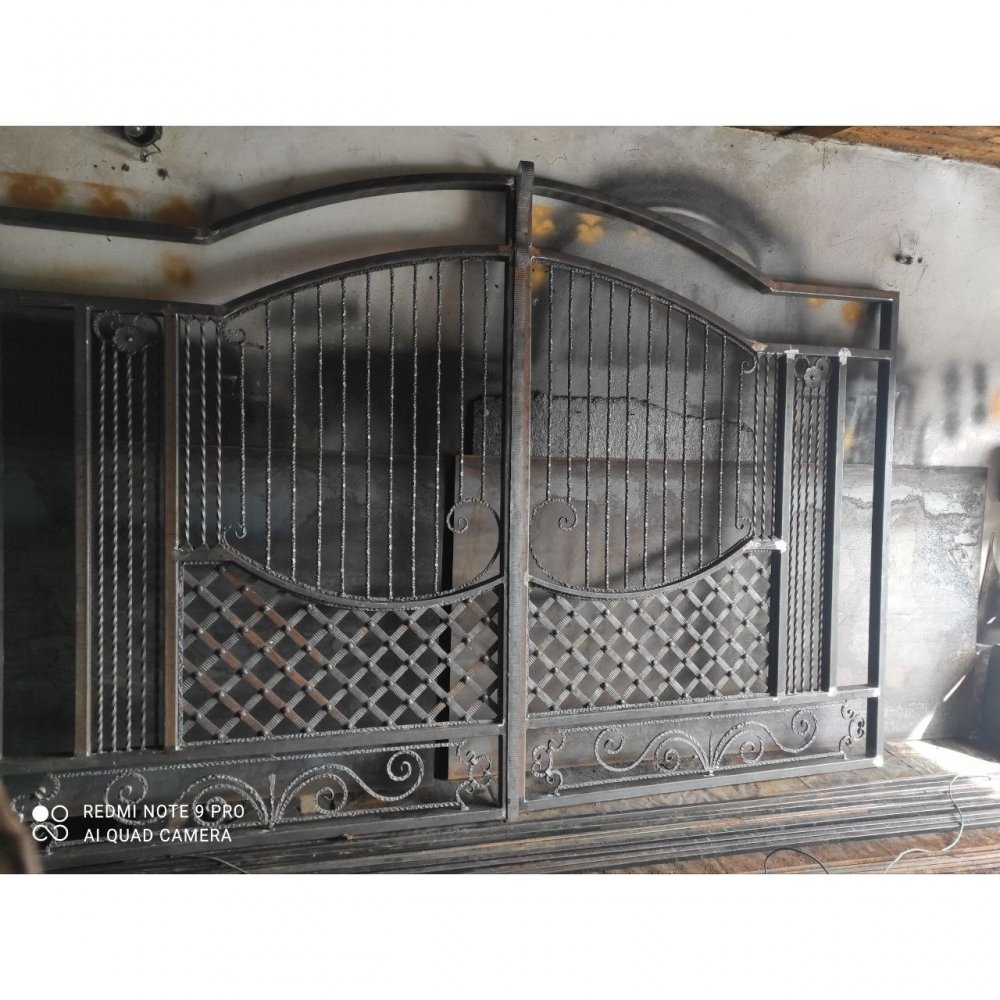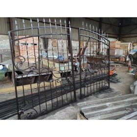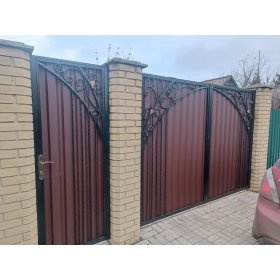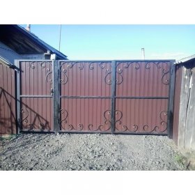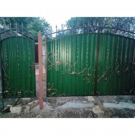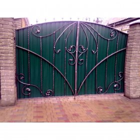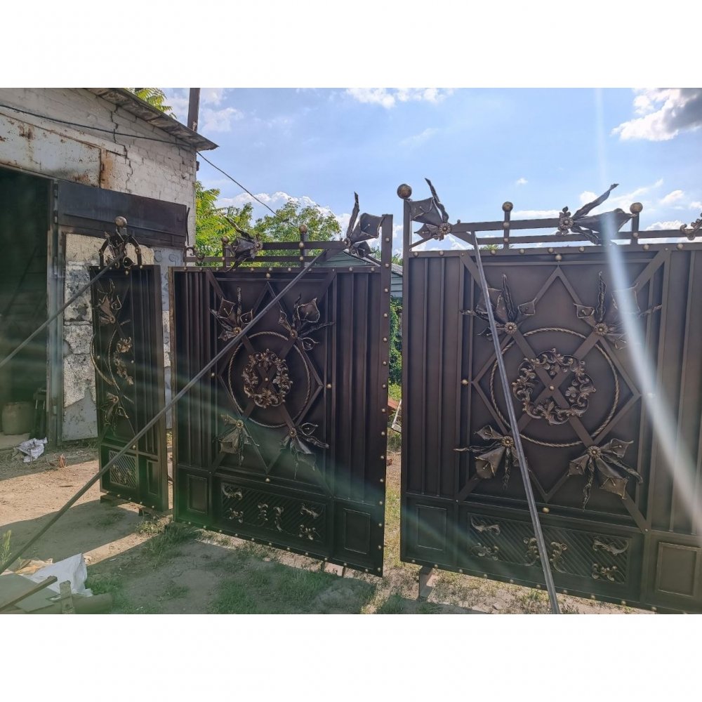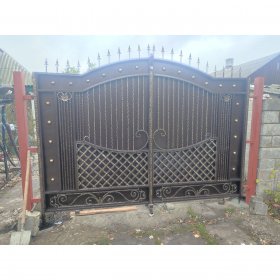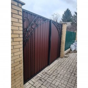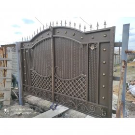 - Кованые ворота — с любыми узорами: виноградные лозы, цветы, геометрия, классические решётки. От однокрылых до двустворчатых, с возможностью автоматики.