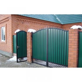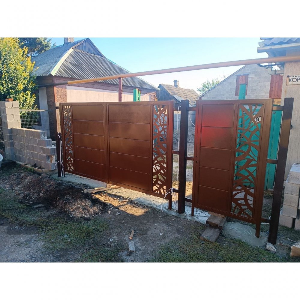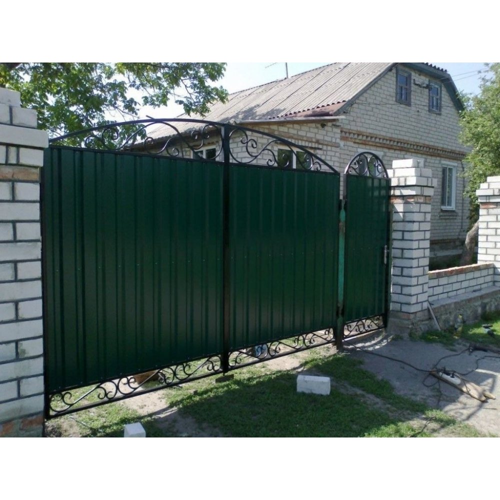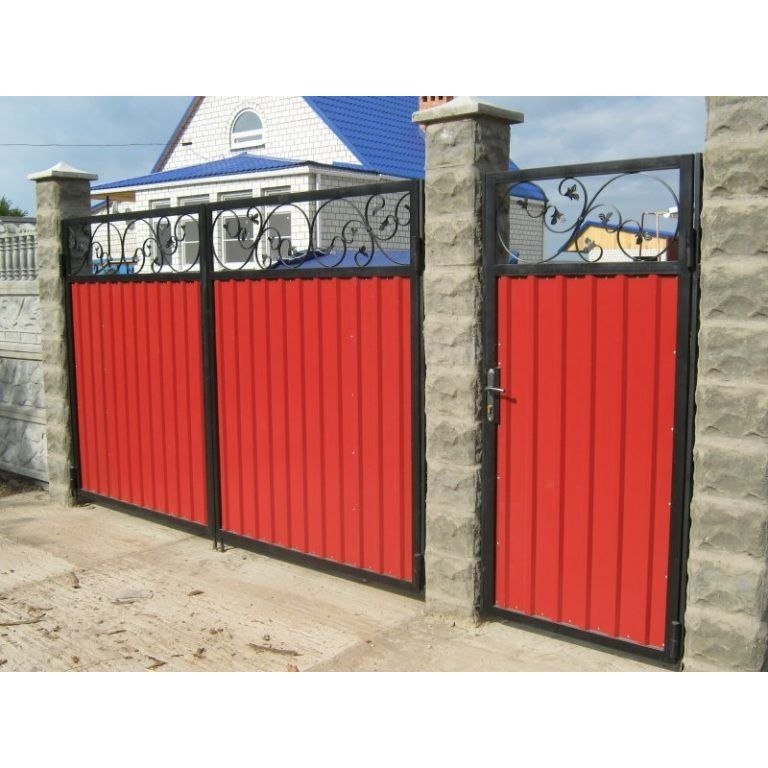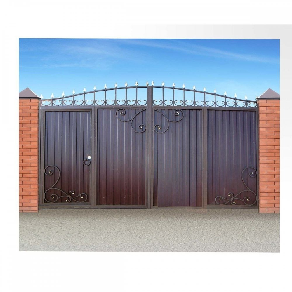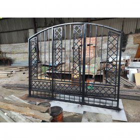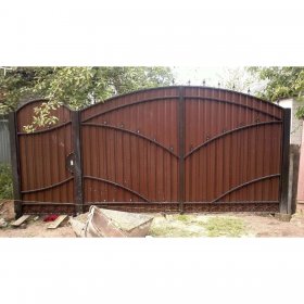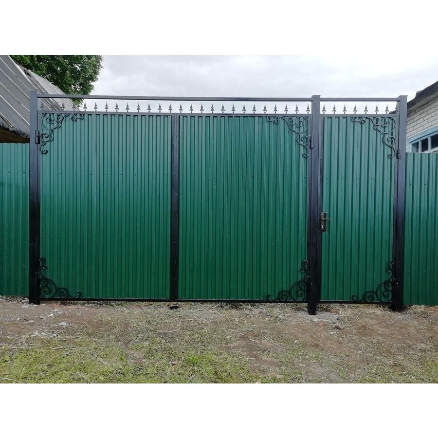 - Кованые ворота — с любыми узорами: виноградные лозы, цветы, геометрия, классические решётки. От однокрылых до двустворчатых, с возможностью автоматики.